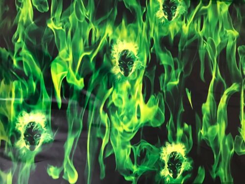 Green Flaming Skulls 100cm wide pattern, shown over a white background. Sold by the metre length.
